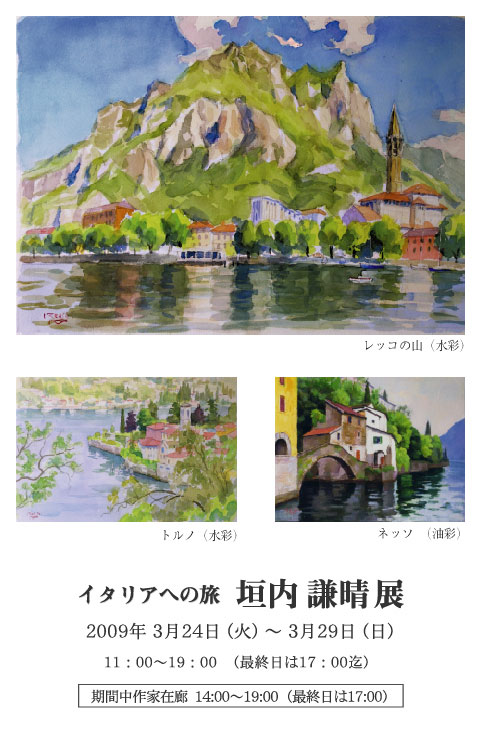 垣内さんは、1973年よりイタリアへの取材旅行をはじめました。 日本の風景には見られない、光線の強い変化を求めるため、以後 16回にわたり各地を訪れ、油彩や水彩で描いた作品を発表し続けています。 このたびは、スイスに接するイタリアの北部のコモ湖の風景や、 南西部の海岸風景を中心に陽光の輝きと緑の風景を水彩14点、 油彩9点でお楽しみいただきます。